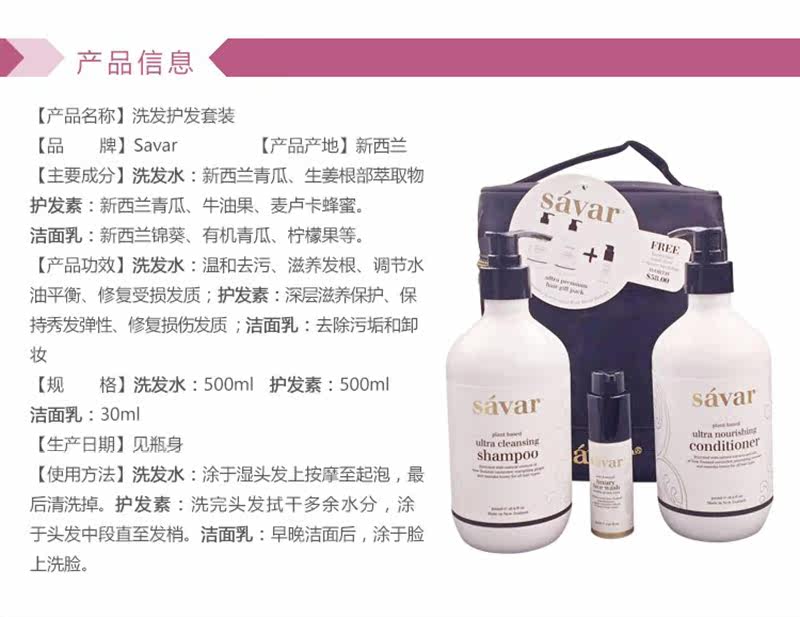 新西兰洗护套装 原装Savar植物精油 洗护套装 洗发水+护发素500ml孕妇可用